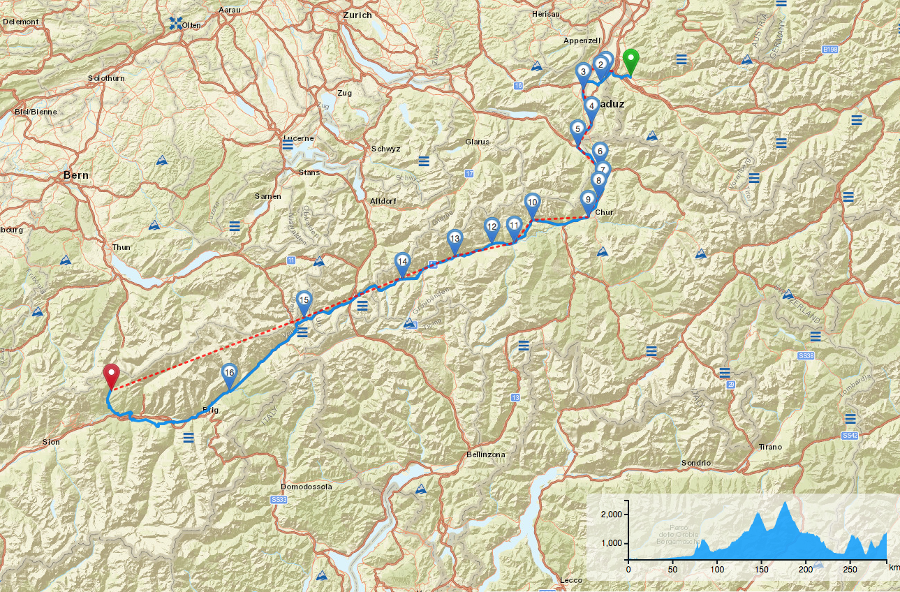 Die Orte: Satteins, Feldkirch, Vaduz, Nendeln (18 Autobahn auf), Chur, Tamins (74 Autobahn ab), Flums, Ilanz, Waltensburg, Distens/Muster, (Abfahrt von der Autobahn, Km 118), Rueras (Oberalppass KM147), Andermatt, (Furkapass KM 177) Furka, Gletsch, Leukerbad;
