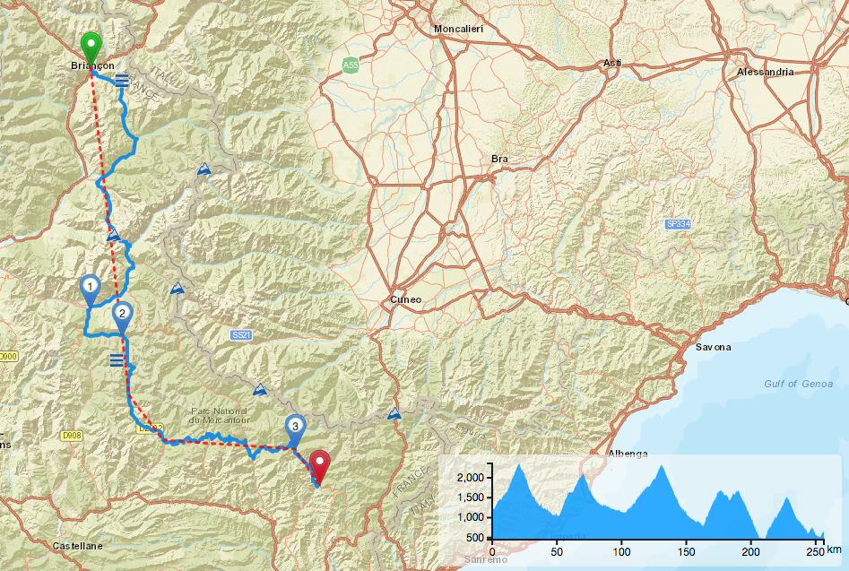 Die Orte: Briancon, Col de Izoard(KM20), Col de Vars (KM72), Col de la Cayolle (KM 132), Col de la Couiolle (KM 190), La-Bollene-Vesubie