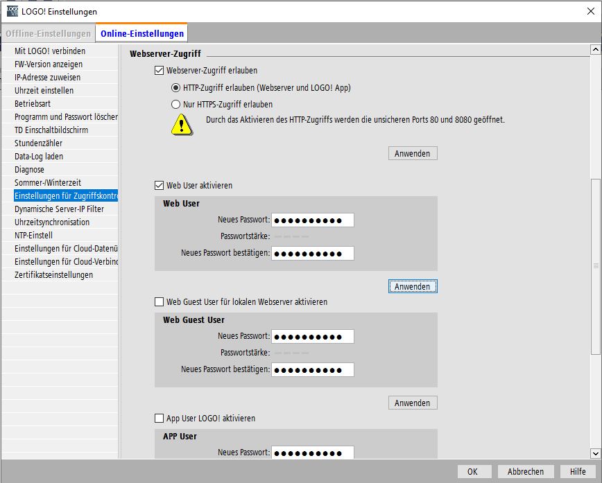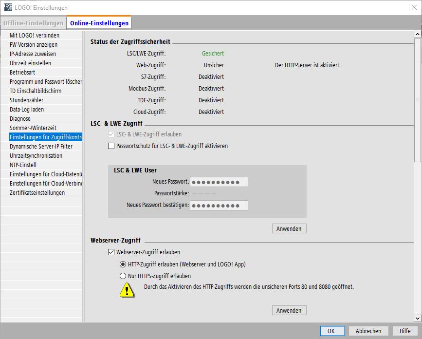 Der LSC & LWE Zugriff ist mit Haken zu erlauben. Der Passwortschutz aktivieren und ein Passwort eingeben. Der Webserver Zugriff ist über HTTP zu erlauben. Geänderte Einträge mit dem Button Anwenden bestätigen.